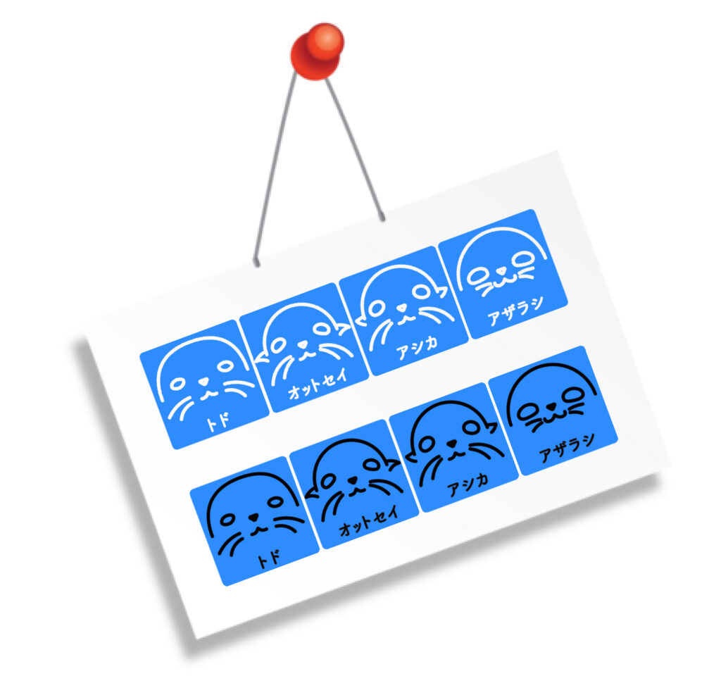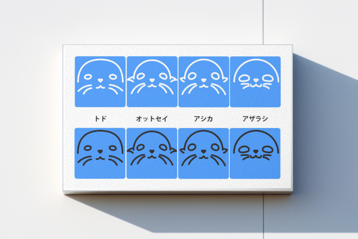 トド、オットセイ、アシカ、アザラシの4種類を、一目で判別できるようそれぞれの身体的特徴を抽出してデザインしました。水族館の楽しい雰囲気に合わせ、シンプルながらも愛着の湧くような柔らかな表情で統一し、施設全体のブランディングに寄与するデザインを目指しました。